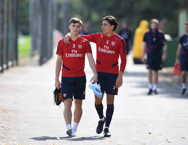 ST ALBANS, ENGLAND – AUGUST 31: (L-R) Kieran Tierney and Hector Bellerin of Arsenal after a training session at London Colney on August 31, 2019 in St Albans, England. (Photo by Stuart MacFarlane/Arsenal FC via Getty Images)