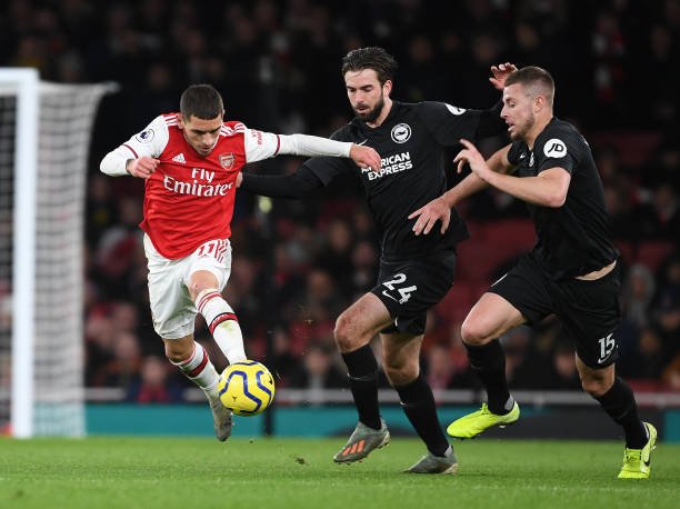 LONDON, ENGLAND – DECEMBER 05: Lucas Torreira of Arsenal breaks past (L) Davy Propper and (R) Adam Webster of Brighton during the Premier League match between Arsenal FC and Brighton & Hove Albion at Emirates Stadium on December 05, 2019 in London, United Kingdom. (Photo by Stuart MacFarlane/Arsenal FC via Getty Images)