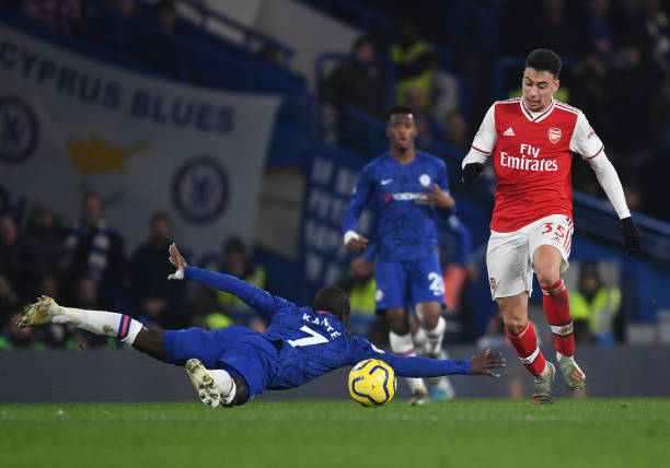 LONDON, ENGLAND – JANUARY 21: Gabriel Martinelli breaks past Chelsea’s N’Golo Kante to score the 1st Arsenal goal during the Premier League match between Chelsea FC and Arsenal FC at Stamford Bridge on January 21, 2020 in London, United Kingdom. (Photo by Stuart MacFarlane/Arsenal FC via Getty Images)