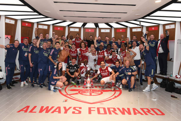 LONDON, ENGLAND – AUGUST 01: The Arsenal players and staff celebrate after the FA Cup Final match between Arsenal and Chelsea at Wembley Stadium on August 01, 2020 in London, England. Football Stadiums around Europe remain empty due to the Coronavirus Pandemic as Government social distancing laws prohibit fans inside venues resulting in all fixtures being played behind closed doors. (Photo by Stuart MacFarlane/Arsenal FC via Getty Images)
