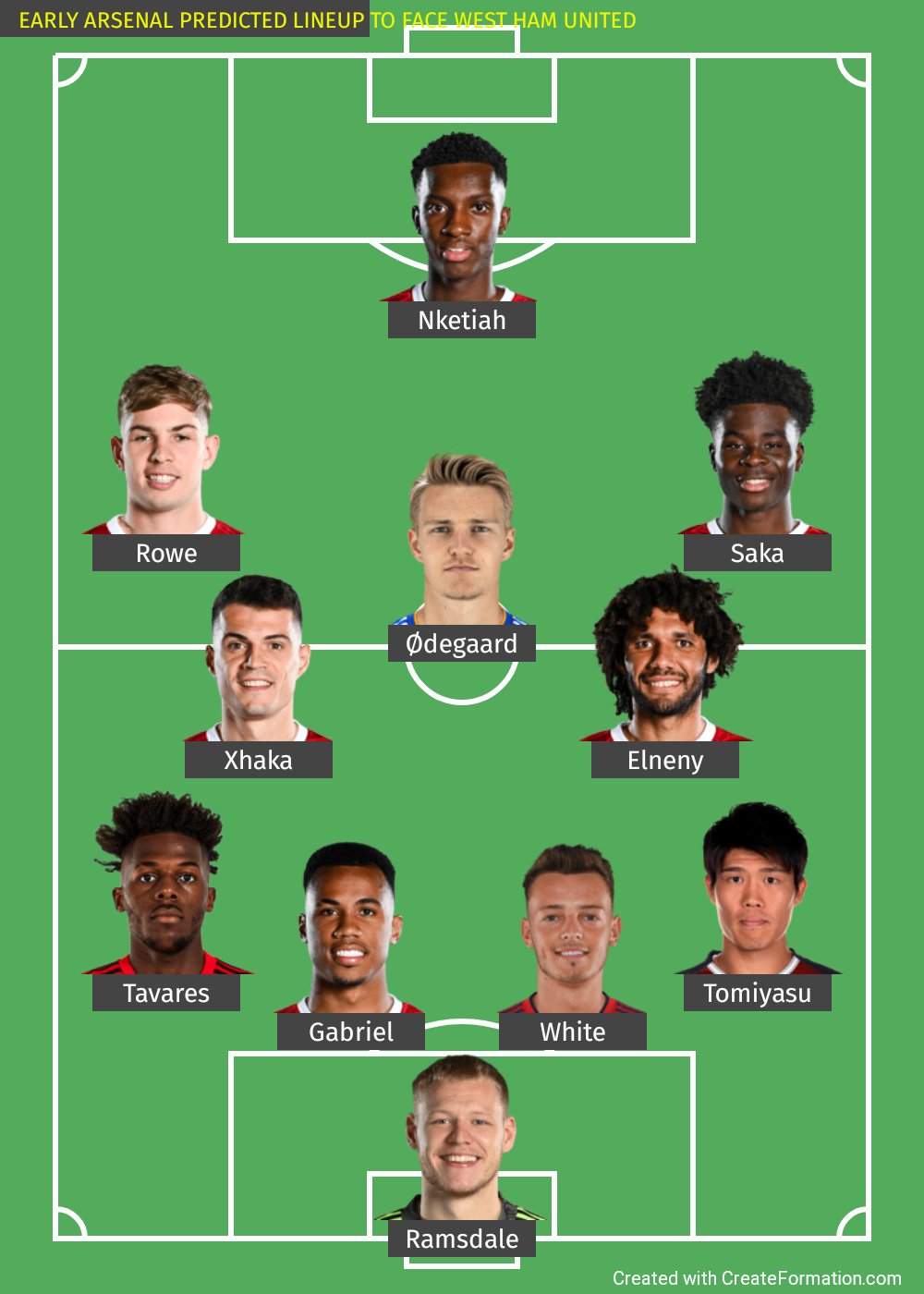 TEXT FORM: Ramsdale, Tavares, Gabriel, White, Tomiyasu, Xhaka, Elneny, Smith Rowe, Odegaard, Saka, Nketiah