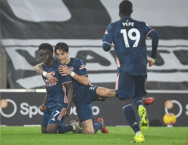SOUTHAMPTON, ENGLAND – JANUARY 26: (L) Bukayo Saka celebrates scoring the 2nd Arsenal goal with (2ndL) Hector Bellerin during the Premier League match between Southampton and Arsenal at St Mary’s Stadium on January 26, 2021 in Southampton, England. Sporting stadiums around the UK remain under strict restrictions due to the Coronavirus Pandemic as Government social distancing laws prohibit fans inside venues resulting in games being played behind closed doors. (Photo by Stuart MacFarlane/Arsenal FC via Getty Images)