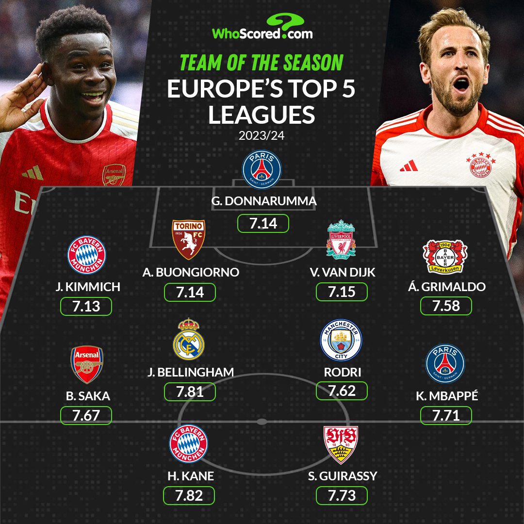 The WhoScored.com Team of the Season features some of the best talents from across Europe’s top leagues, reflecting the players who had the most significant impact over the season. Alongside Saka, the team includes: