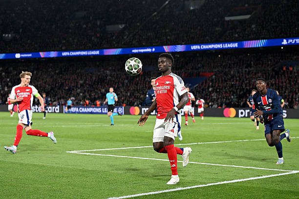 PARIS, FRANCE – MAY 07: Bukayo Saka of Arsenal watches an aerial ball during the UEFA Champions League 2024/25 Semi Final Second Leg match between Paris Saint-Germain and Arsenal FC at Parc des Princes on May 07, 2025 in Paris, France. (Photo by Stuart MacFarlane/Arsenal FC via Getty Images)