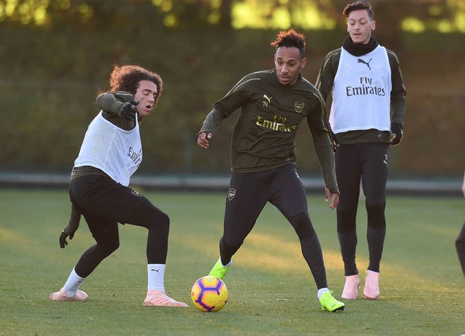 ST ALBANS, ENGLAND - NOVEMBER 02: (L-R) Matteo Guendouzi and Pierre-Emerick Aubameyang of Arsenal during a training session at London Colney on November 2, 2018 in St Albans, England. (Photo by Stuart MacFarlane/Arsenal FC via Getty Images) *** Local Caption *** Matteo Guendouzi;Pierre- Emerick Aubameyang