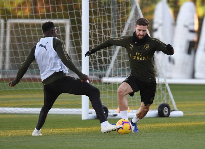- ST ALBANS, ENGLAND – NOVEMBER 02: (L-R) Danny Welbeck and Shkodran Mustafi of Arsenal during a training session at London Colney on November 2, 2018 in St Albans, England. (Photo by Stuart MacFarlane/Arsenal FC via Getty Images) *** Local Caption *** Danny Welbeck;Shkodran Mustafi
