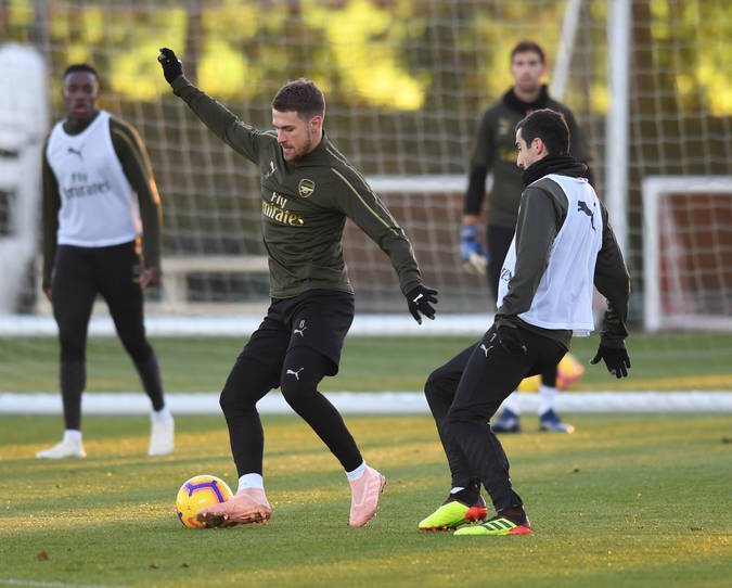 - ST ALBANS, ENGLAND – NOVEMBER 02: (L-R) Aaron Ramsey and Henrikh Mkhitaryan of Arsenal during a training session at London Colney on November 2, 2018 in St Albans, England. (Photo by Stuart MacFarlane/Arsenal FC via Getty Images) *** Local Caption *** Aaron Ramsey;Henrikh Mkhitaryan