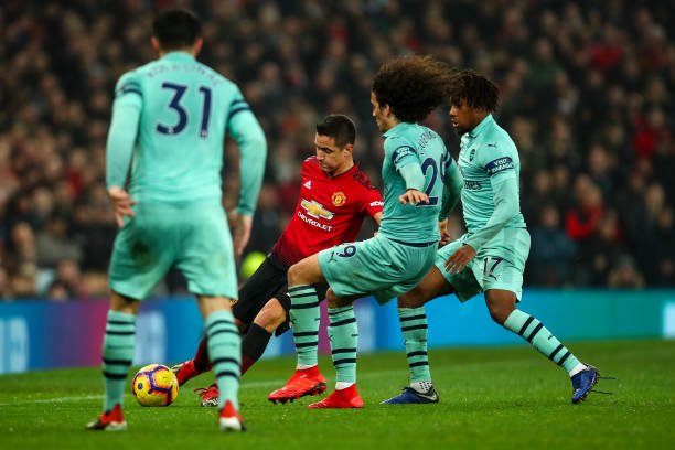 MANCHESTER, ENGLAND - DECEMBER 05: Ander Herrera of Manchester United and Matteo Guendouzi of Arsenal during the Premier League match between Manchester United and Arsenal FC at Old Trafford on December 5, 2018 in Manchester, United Kingdom. (Photo by Robbie Jay Barratt - AMA/Getty Images)