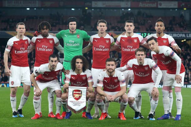 LONDON, ENGLAND - FEBRUARY 21: Arsenal pose for a team group photo - top, l to r: Stephan Lichtsteiner, Alex Iwobi, goalkeeper Petr Cech, Laurent Koscielny, Granit Xhaka and Pierre-Emerick Aubameyang - bottom, l to r: Henrikh Mkhitaryan, Matteo Guendouzi, Shkodran Mustafi, Nacho Montreal and Mesut Ozil during the UEFA Europa League Round of 32 Second Leg match between Arsenal and BATE Borisov at England on February 21, 2019 in London, United Kingdom. (Photo by Charlotte Wilson/Offside/Getty Images)