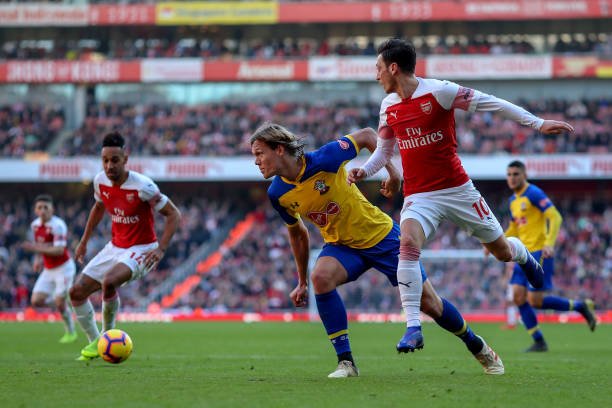 24th February 2019, Emirates Stadium, London, England; EPL Premier League Football, Arsenal versus Southampton; Mesut Ozil of Arsenal passes the ball around Jannik Vestergaard of Southampton to Pierre-Emerick Aubameyang (photo by Shaun Brooks/Action Plus via Getty Images)