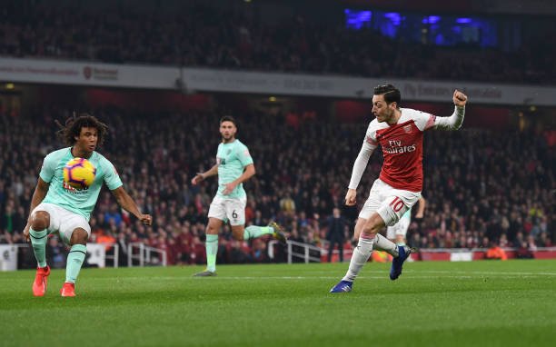 LONDON, ENGLAND - FEBRUARY 27: Mesut Ozil scores a goal for Arsenal during the Premier League match between Arsenal FC and AFC Bournemouth at Emirates Stadium on February 27, 2019 in London, United Kingdom. (Photo by David Price/Arsenal FC via Getty Images)