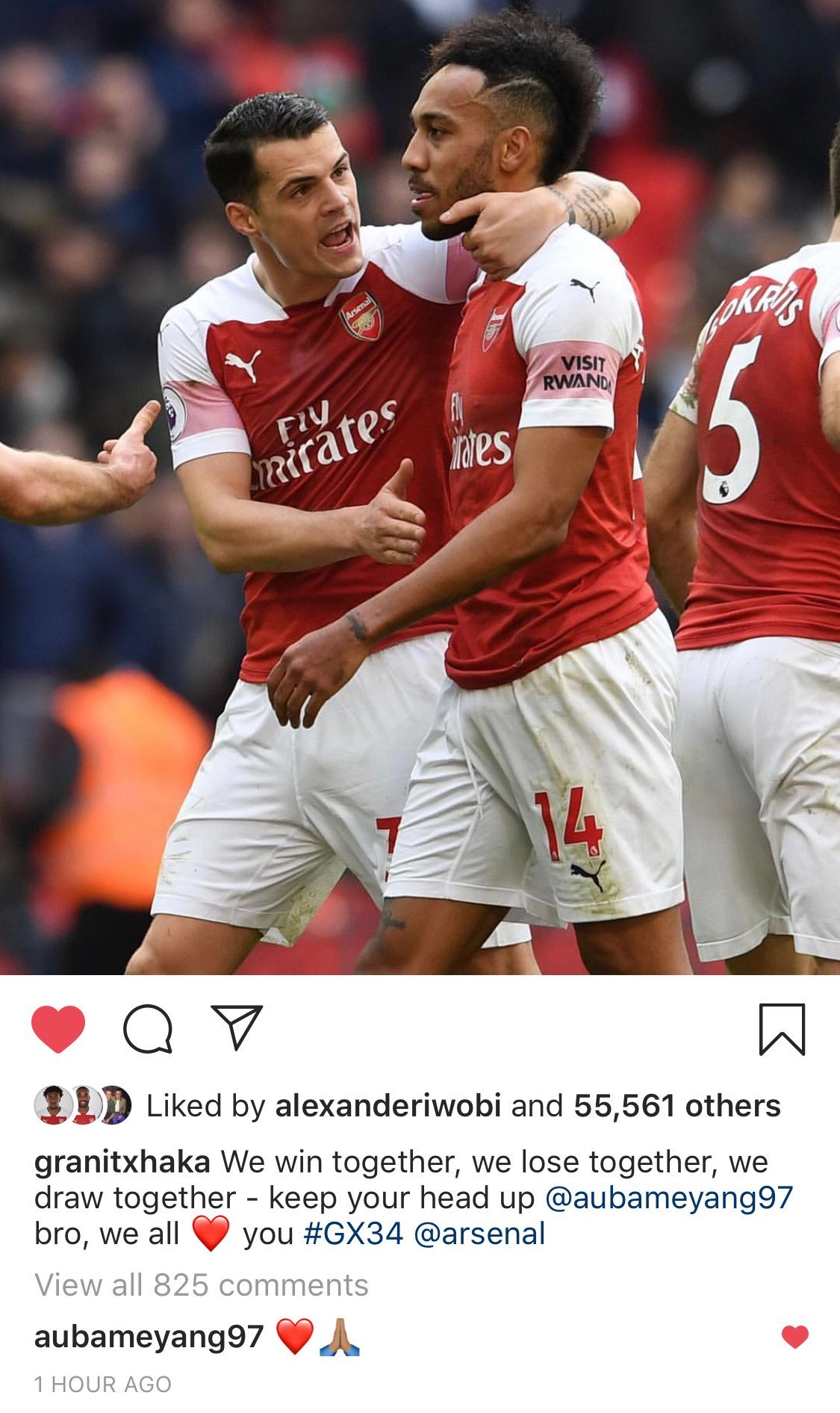 “We win together, we lose together, we draw together – keep your head up Aubameyang.”