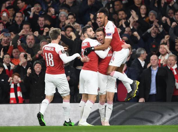 LONDON, ENGLAND - APRIL 11: (2ndR) Aaron Ramsey celebrates scoring the 1st Arsenal goal with (R) Pierre-Emerick Aubameyang (L) Nacho Monreal and (2ndL) Sed Kolasianc during the UEFA Europa League Quarter Final First Leg match between Arsenal and S.S.C. Napoli at Emirates Stadium on April 11, 2019 in London, England. (Photo by Stuart MacFarlane/Arsenal FC via Getty Images)