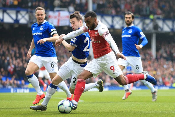 LIVERPOOL, ENGLAND - APRIL 07: Alexandre Lacazette of Arsenal battles with Seamus Coleman of Everton during the Premier League match between Everton and Arsenal at Goodison Park on April 7, 2019 in Liverpool, United Kingdom. (Photo by Simon Stacpoole/Offside/Getty Images)