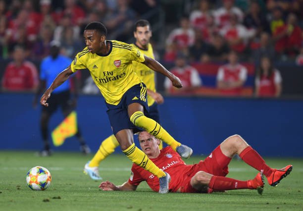 CARSON, CALIFORNIA – JULY 17: Joe Willock of Arsenal takes on Johnasson of Bayern Munich during the friendly match between Arsenal and FC Bayern Munich at Dignity Health Sports Park on July 17, 2019 in Carson, California. (Photo by Stuart MacFarlane/Arsenal FC via Getty Images)