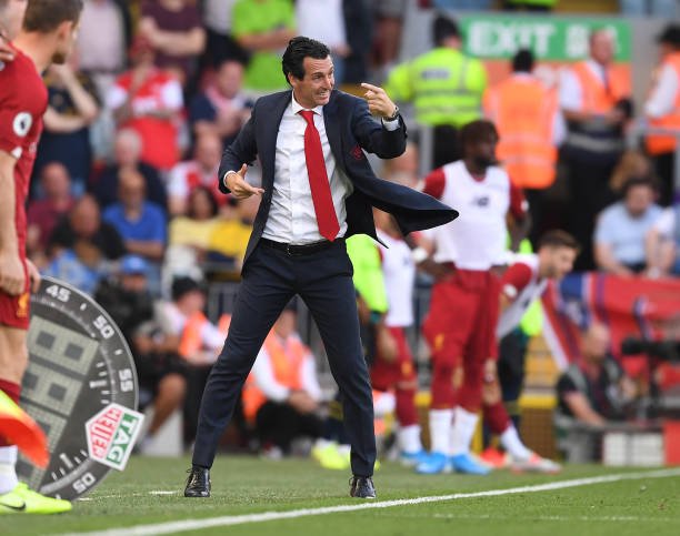 LIVERPOOL, ENGLAND – AUGUST 24: Arsenal Head Coach Unai Emery during the Premier League match between Liverpool FC and Arsenal FC at Anfield on August 24, 2019 in Liverpool, United Kingdom. (Photo by Stuart MacFarlane/Arsenal FC via Getty Images)