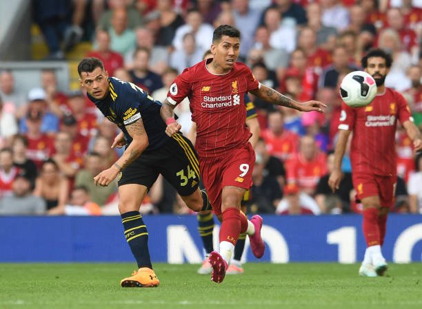 LIVERPOOL, ENGLAND – AUGUST 24: Granit Xhaka of Arsenal is challenged by Roberto Firmino of Liverpool during the Premier League match between Liverpool FC and Arsenal FC at Anfield on August 24, 2019 in Liverpool, United Kingdom. (Photo by David Price/Arsenal FC via Getty Images)