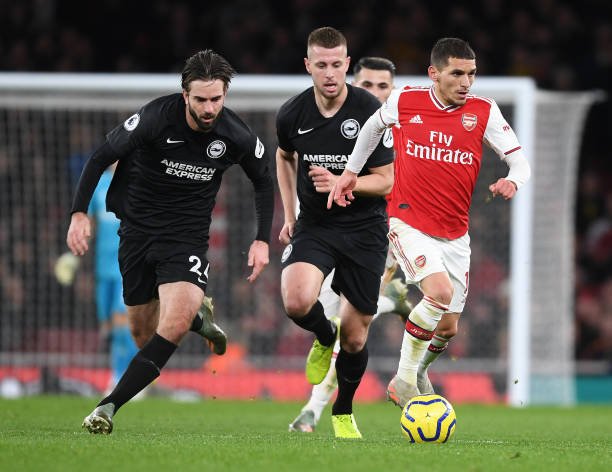 LONDON, ENGLAND – DECEMBER 05: Lucas Torreira of Arsenal breaks past (L) Davy Propper and (R) Adam Webster of Brighton during the Premier League match between Arsenal FC and Brighton & Hove Albion at Emirates Stadium on December 05, 2019 in London, United Kingdom. (Photo by Stuart MacFarlane/Arsenal FC via Getty Images)