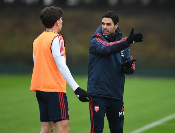 ST ALBANS, ENGLAND – JANUARY 24: Arsenal Head Coach Mikel Arteta with Hector Bellerin during a training session at London Colney on January 24, 2020 in St Albans, England. (Photo by Stuart MacFarlane/Arsenal FC via Getty Images)