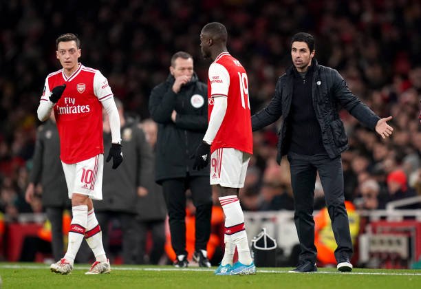 Arsenal Manager Mikel Arteta speaks with Mesut Ozil (left) and Nicolas Pepe on the touchline during the FA Cup third round match at Emirates Stadium, London. (Photo by John Walton/PA Images via Getty Images)