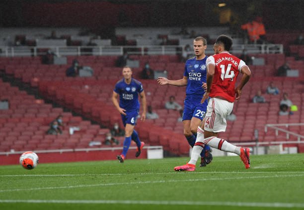 LONDON, ENGLAND - JULY 07: Pierre-Emerick Aubameyang scores Arsenal's goal during the Premier League match between Arsenal FC and Leicester City at Emirates Stadium on July 07, 2020 in London, England. (Photo by David Price/Arsenal FC via Getty Images)