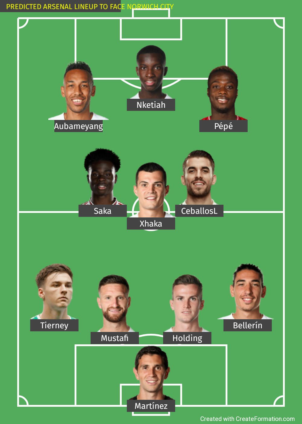 TEXT FORM: Martinez, Tierney, Mustafi, Holding, Bellerin, Saka, Xhaka, Ceballos, Aubameyang, Nketiah, Pepe