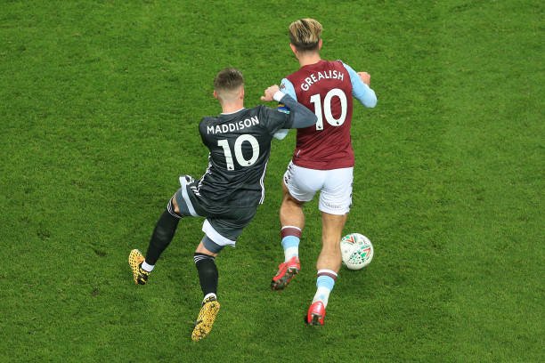 BIRMINGHAM, ENGLAND - JANUARY 28: James Maddison of Leicester battles with Jack Grealish of Villa during the Carabao Cup Semi Final match between Aston Villa and Leicester City at Villa Park on January 28, 2020 in Birmingham, England. (Photo by Simon Stacpoole/Offside/Offside via Getty Images)
