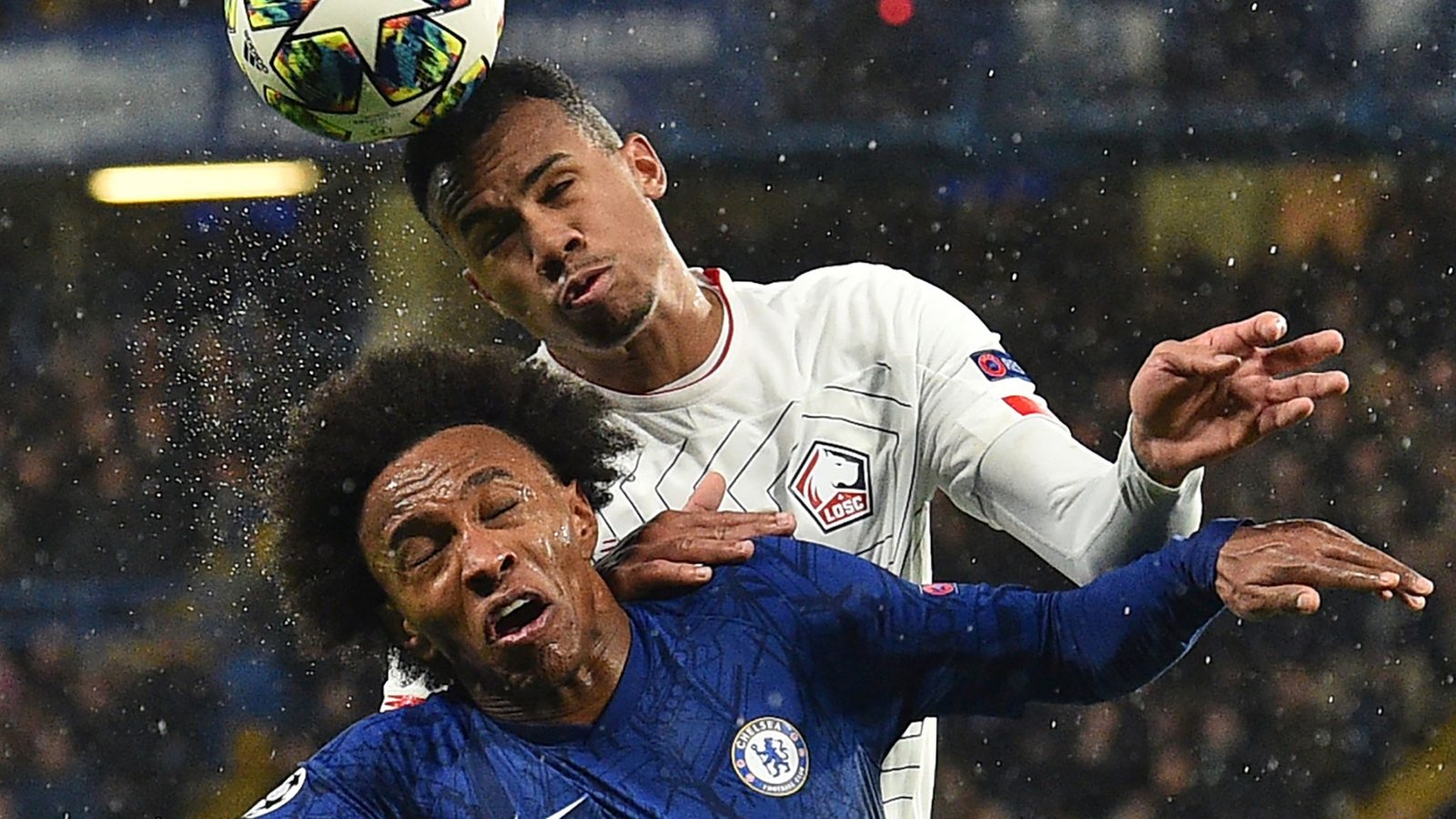 Gabriel in an aerial duel with Willian who is also an Arsenal target