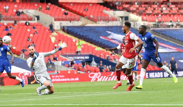 LONDON, ENGLAND – AUGUST 01: Pierre-Emerick Aubameyang scores Arsenal’ 2nd goal during the FA Cup Final match between Arsenal and Chelsea at Wembley Stadium on August 01, 2020 in London, England. Football Stadiums around Europe remain empty due to the Coronavirus Pandemic as Government social distancing laws prohibit fans inside venues resulting in all fixtures being played behind closed doors. (Photo by David Price/Arsenal FC via Getty Images)
