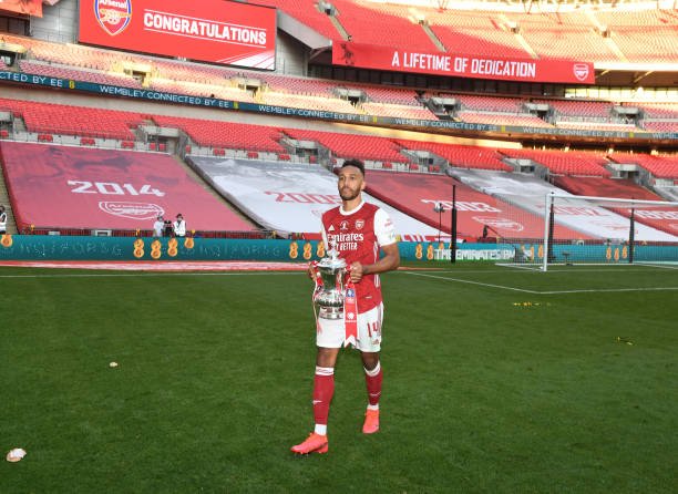 LONDON, ENGLAND - AUGUST 01: Pierre-Emerick Aubameyang of Arsenal celebrates after the FA Cup Final match between Arsenal and Chelsea at Wembley Stadium on August 01, 2020 in London, England. Football Stadiums around Europe remain empty due to the Coronavirus Pandemic as Government social distancing laws prohibit fans inside venues resulting in all fixtures being played behind closed doors. (Photo by Stuart MacFarlane/Arsenal FC via Getty Images)