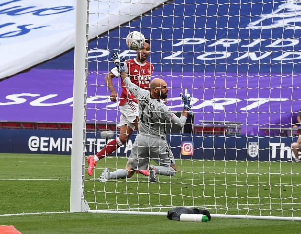 LONDON, ENGLAND - AUGUST 01: Pierre-Emerick Aubameyang scores the 2nd Arsenal goal during the FA Cup Final match between Arsenal and Chelsea at Wembley Stadium on August 01, 2020 in London, England. Football Stadiums around Europe remain empty due to the Coronavirus Pandemic as Government social distancing laws prohibit fans inside venues resulting in all fixtures being played behind closed doors. (Photo by Stuart MacFarlane/Arsenal FC via Getty Images)