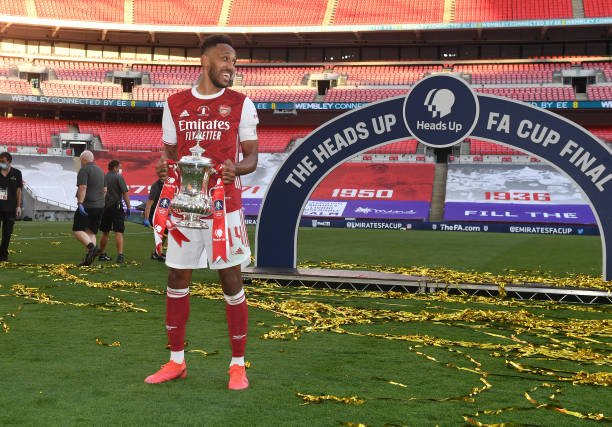 LONDON, ENGLAND - AUGUST 01: Pierre-Emerick Aubameyang of Arsenal celebrates after the FA Cup Final match between Arsenal and Chelsea at Wembley Stadium on August 01, 2020 in London, England. Football Stadiums around Europe remain empty due to the Coronavirus Pandemic as Government social distancing laws prohibit fans inside venues resulting in all fixtures being played behind closed doors. (Photo by Stuart MacFarlane/Arsenal FC via Getty Images)