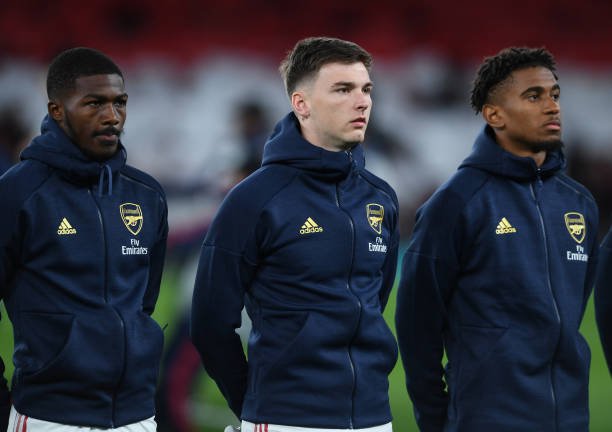 LONDON, ENGLAND - OCTOBER 03: Ainsley Maitland-Niles, Kieran Tierney and Reiss Nelson of Arsenal before the UEFA Europa League group F match between Arsenal FC and Standard Liege at Emirates Stadium on October 03, 2019 in London, United Kingdom. (Photo by David Price/Arsenal FC via Getty Images)