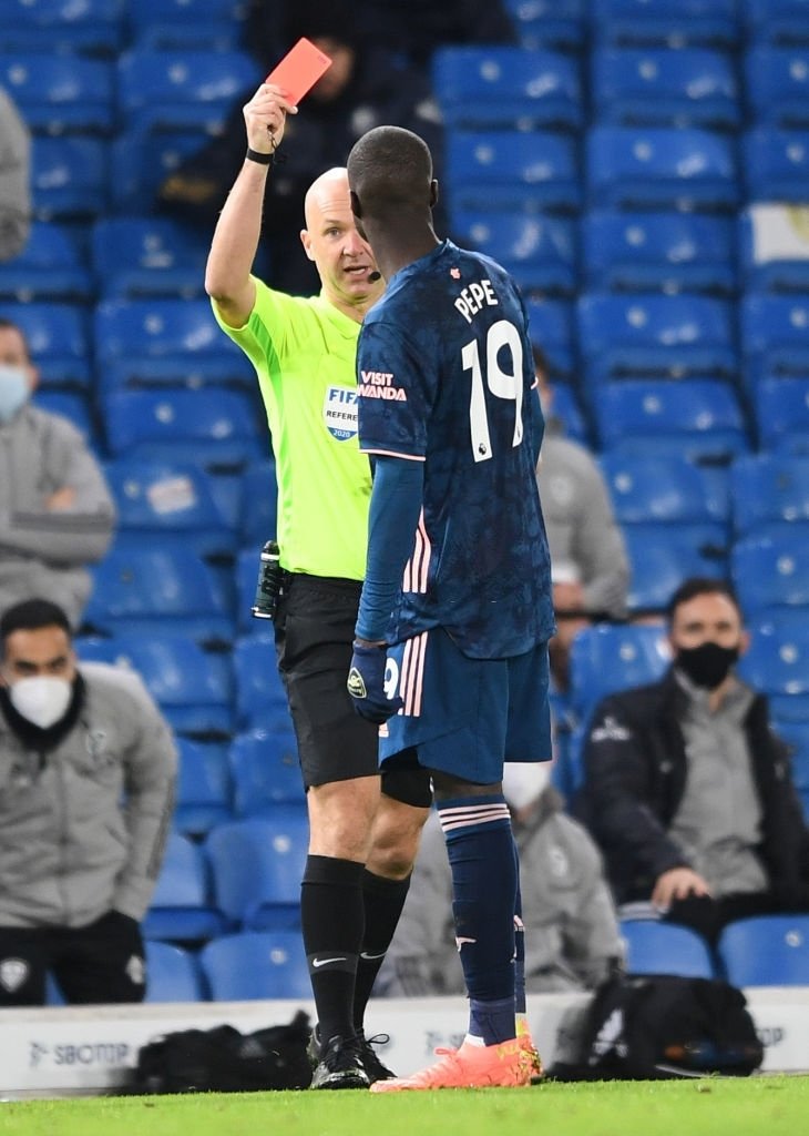Arsenal’s record signing Nicolas Pepe was sent off early in the second half during the Leeds United match.