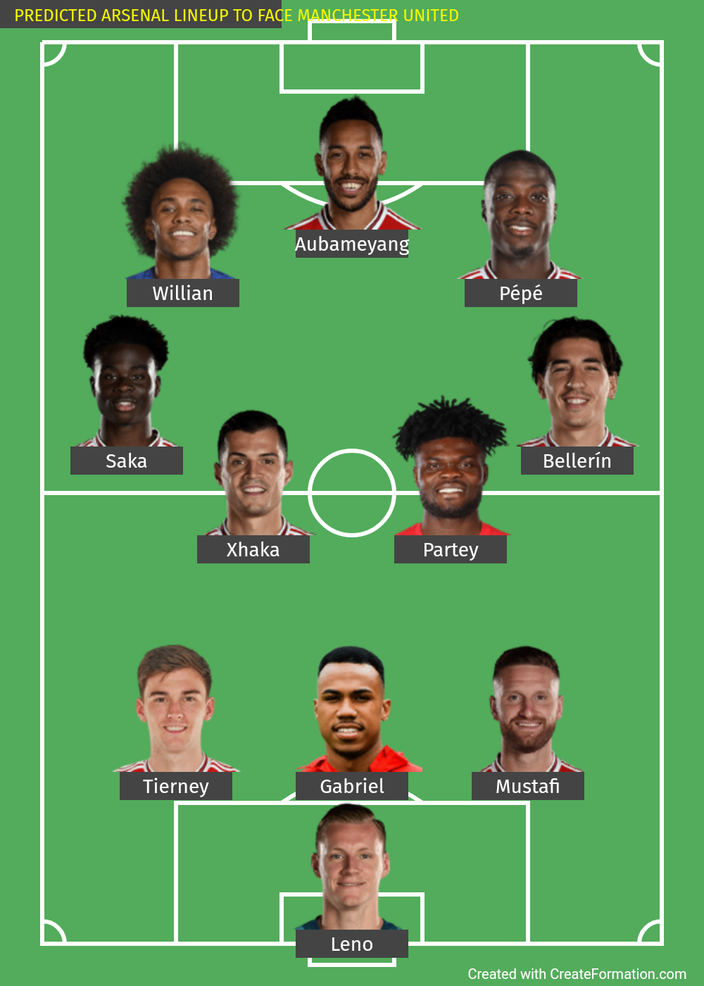 Leno, Tierney, Gabriel, Mustafi, Bellerin, Saka, Xhaka, Partey, Bellerin, Willian, Aubameyang, Pepe