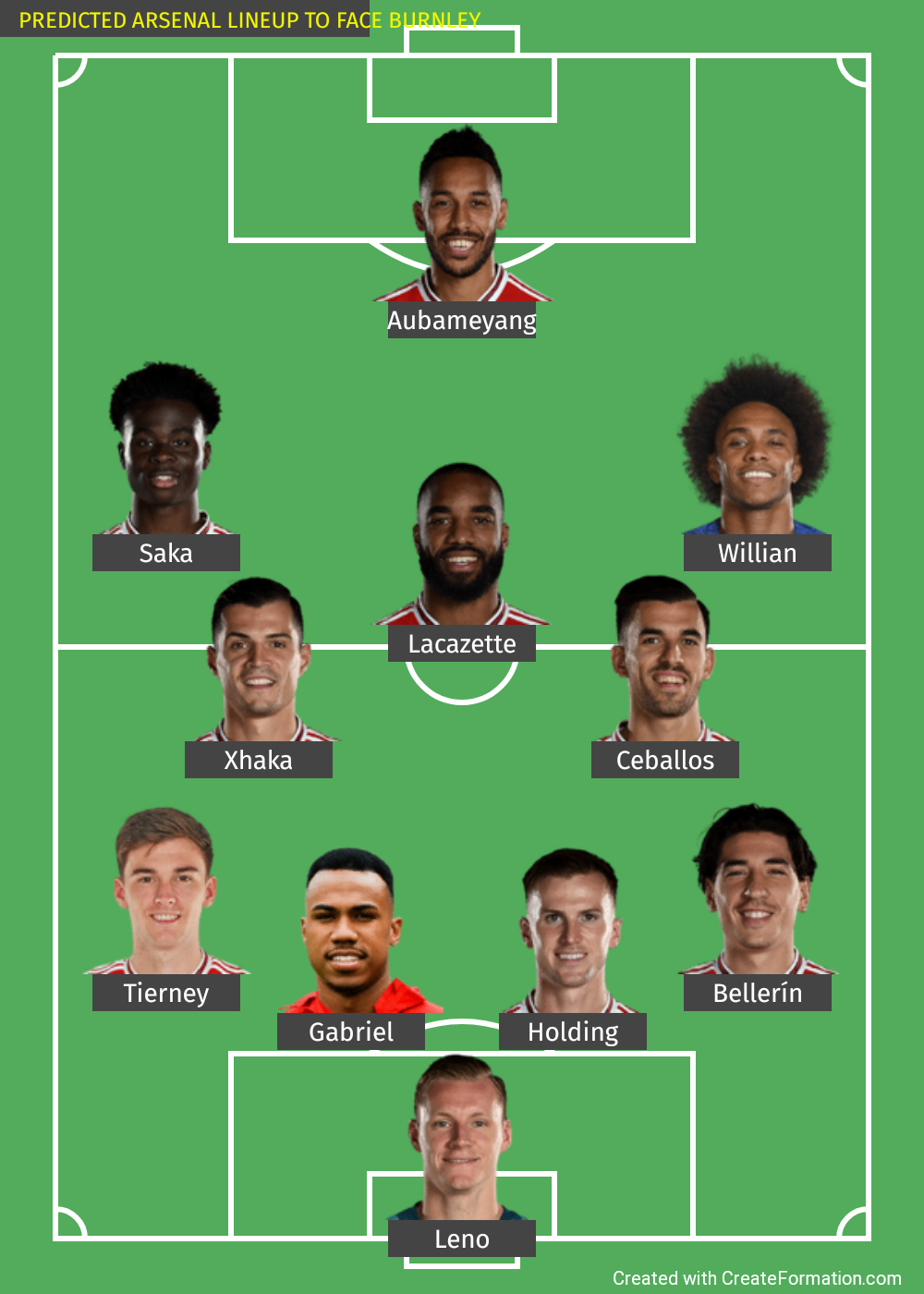 TEXT FORM: Leno, Tierney, Gabriel, Holding, Bellerin, Xhaka, Ceballos, Saka, Lacazette, Willian, Aubameyang