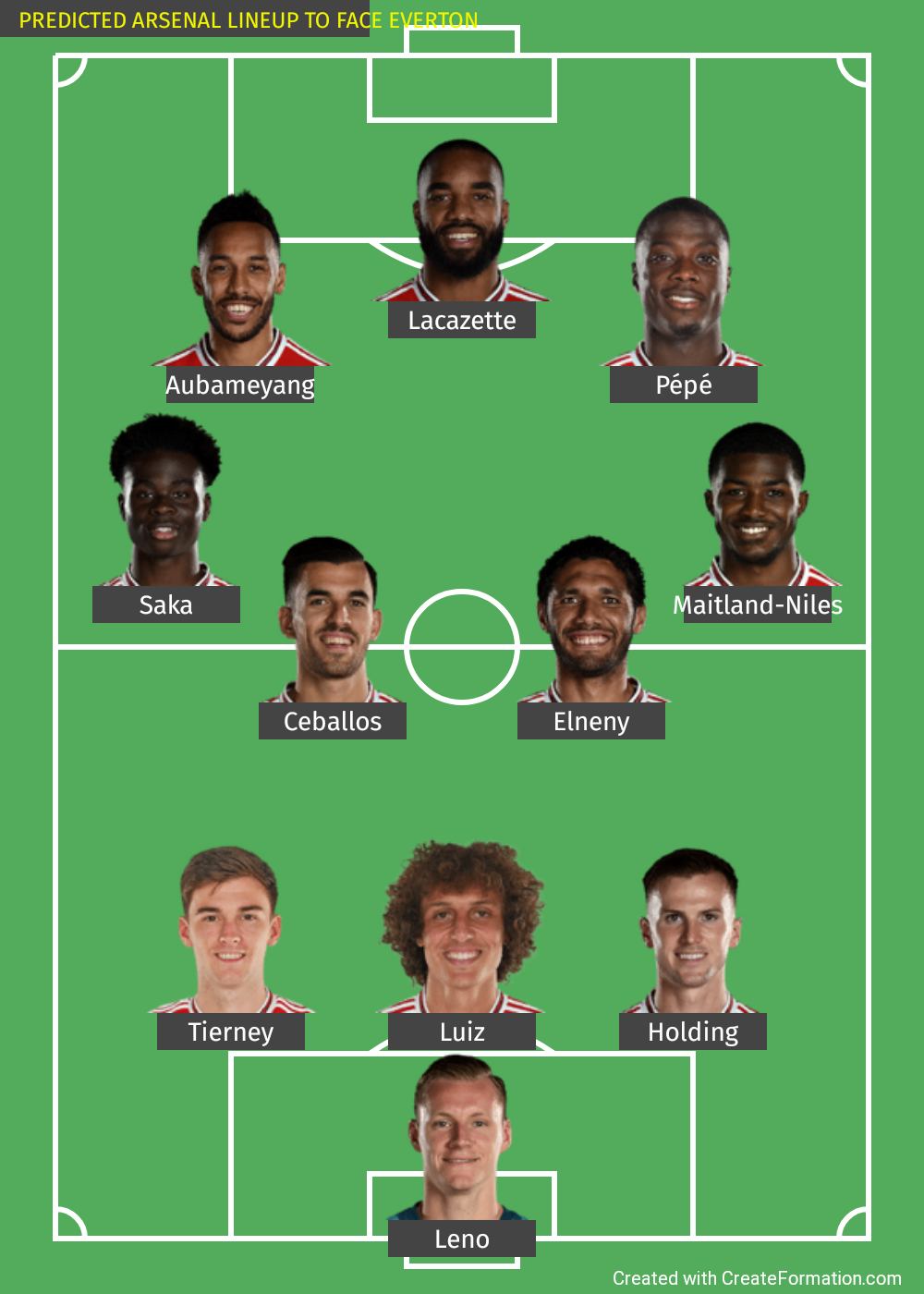 TEXT FORM: Leno, Tierney, Luiz, Holding, Saka, Ceballos, Elneny, Maitland-Niles, Aubameyang, Lacazette, Pepe