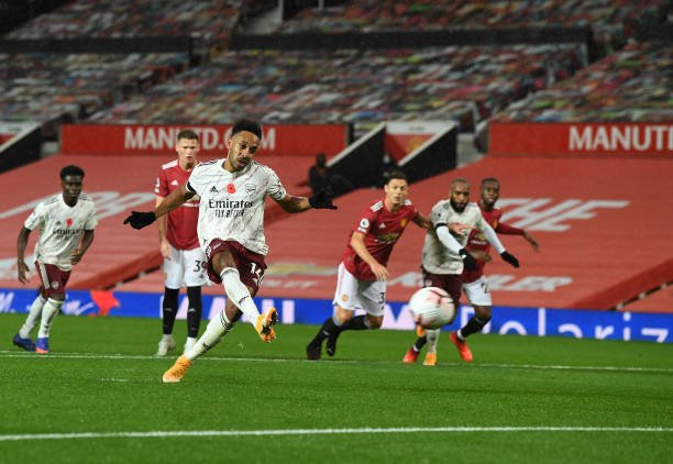 Aubameyang scored the winning goal against Man United at Old Trafford. (Photo by Stuart MacFarlane/Arsenal FC via Getty Images)