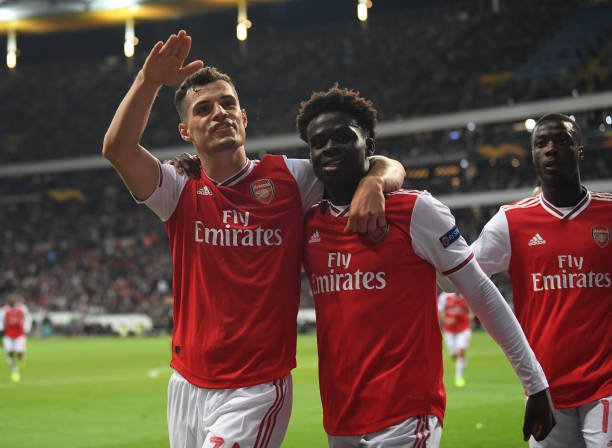FRANKFURT AM MAIN, GERMANY – SEPTEMBER 19: Bukayo Saka celebrates scoring Arsenal’s 2nd goal with Granit Xhaka during the UEFA Europa League group F match between Eintracht Frankfurt and Arsenal FC at on September 19, 2019 in Frankfurt am Main, Germany. (Photo by David Price/Arsenal FC via Getty Images)
