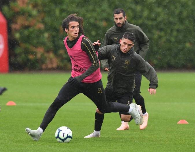 ST ALBANS, ENGLAND - OCTOBER 06: (L-R) Matteo Guendouzi and Lucas Torreira of Arsenal during a training sesion at London Colney on October 5, 2018 in St Albans, England. (Photo by Stuart MacFarlane/Arsenal FC via Getty Images) *** Local Caption *** Matteo Guendouzi;Lucas Torreira