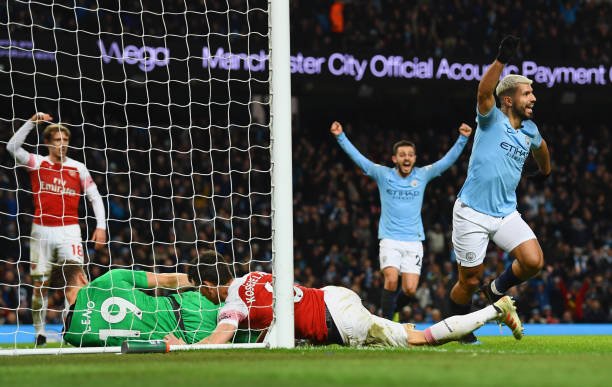 MANCHESTER, ENGLAND – FEBRUARY 03: Sergio Aguero of Manchester City celebrates after scoring his team’s third goal with Raheem Sterling during the Premier League match between Manchester City and Arsenal FC at Etihad Stadium on February 3, 2019 in Manchester, United Kingdom. (Photo by Stu Forster/Getty Images)