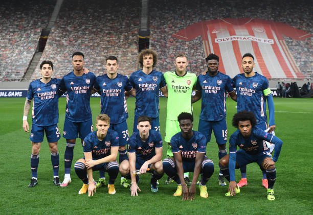 PIRAEUS, GREECE - MARCH 11: The Arsenal team line up before the UEFA Europa League Round of 16 First Leg match between Olympiacos and Arsenal at Karaiskakis Stadium on March 11, 2021 in Piraeus, Greece. Sporting stadiums around Europe remain under strict restrictions due to the Coronavirus Pandemic as Government social distancing laws prohibit fans inside venues resulting in games being played behind closed doors. (Photo by Stuart MacFarlane/Arsenal FC via Getty Images)