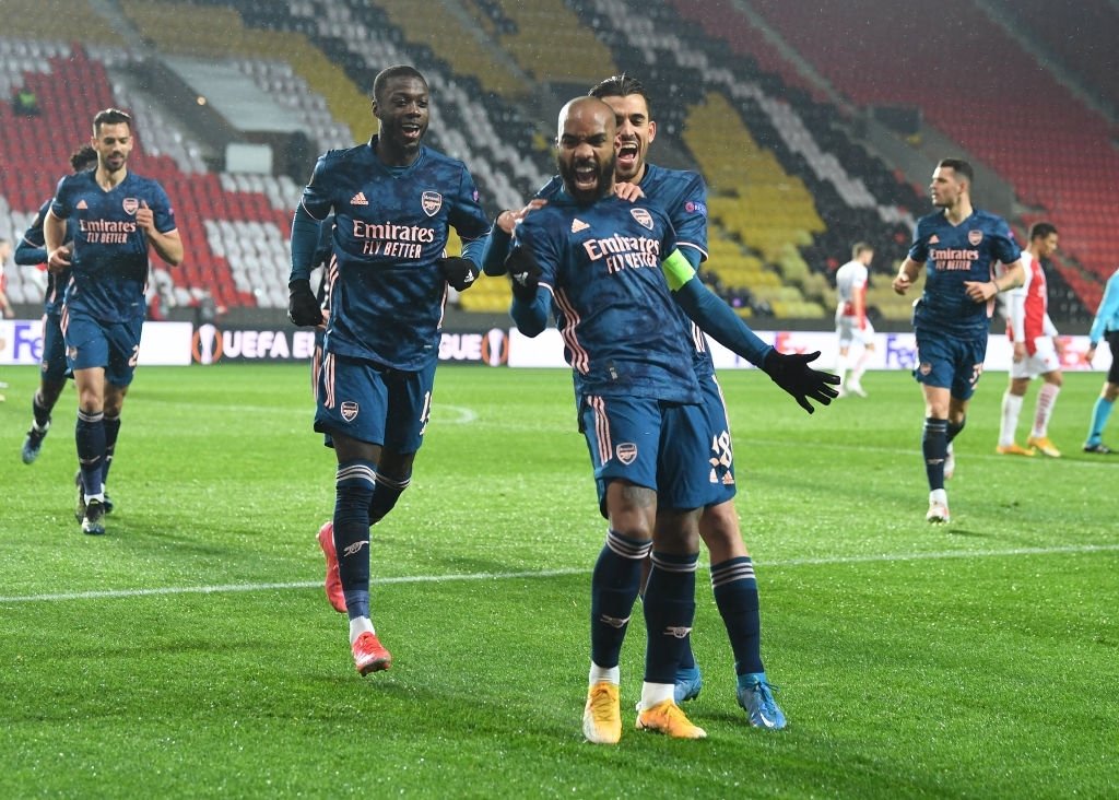 PRAGUE, CZECH REPUBLIC - APRIL 15: (2ndL) Alex Lacazette celebrates scoring the 2nd Arsenal goal with (R) Dani Ceballos and (L) Nicolas Pepe during the UEFA Europa League Quarter Final Second Leg match between Slavia Praha and Arsenal FC at Eden Arena on April 15, 2021 in Prague, Czech Republic. Sporting stadiums around Europe remain under strict restrictions due to the Coronavirus Pandemic as Government social distancing laws prohibit fans inside venues resulting in games being played behind closed doors. (Photo by Stuart MacFarlane/Arsenal FC via Getty Images)