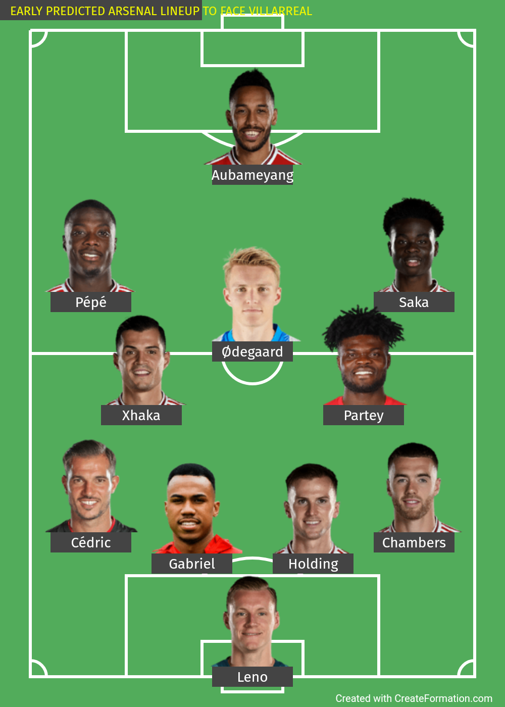 TEXT FORMAT: Leno, Cedric, Gabriel, Holding, Chambers, Xhaka, Partey, Pepe, Odegaard, Saka, Aubameyang