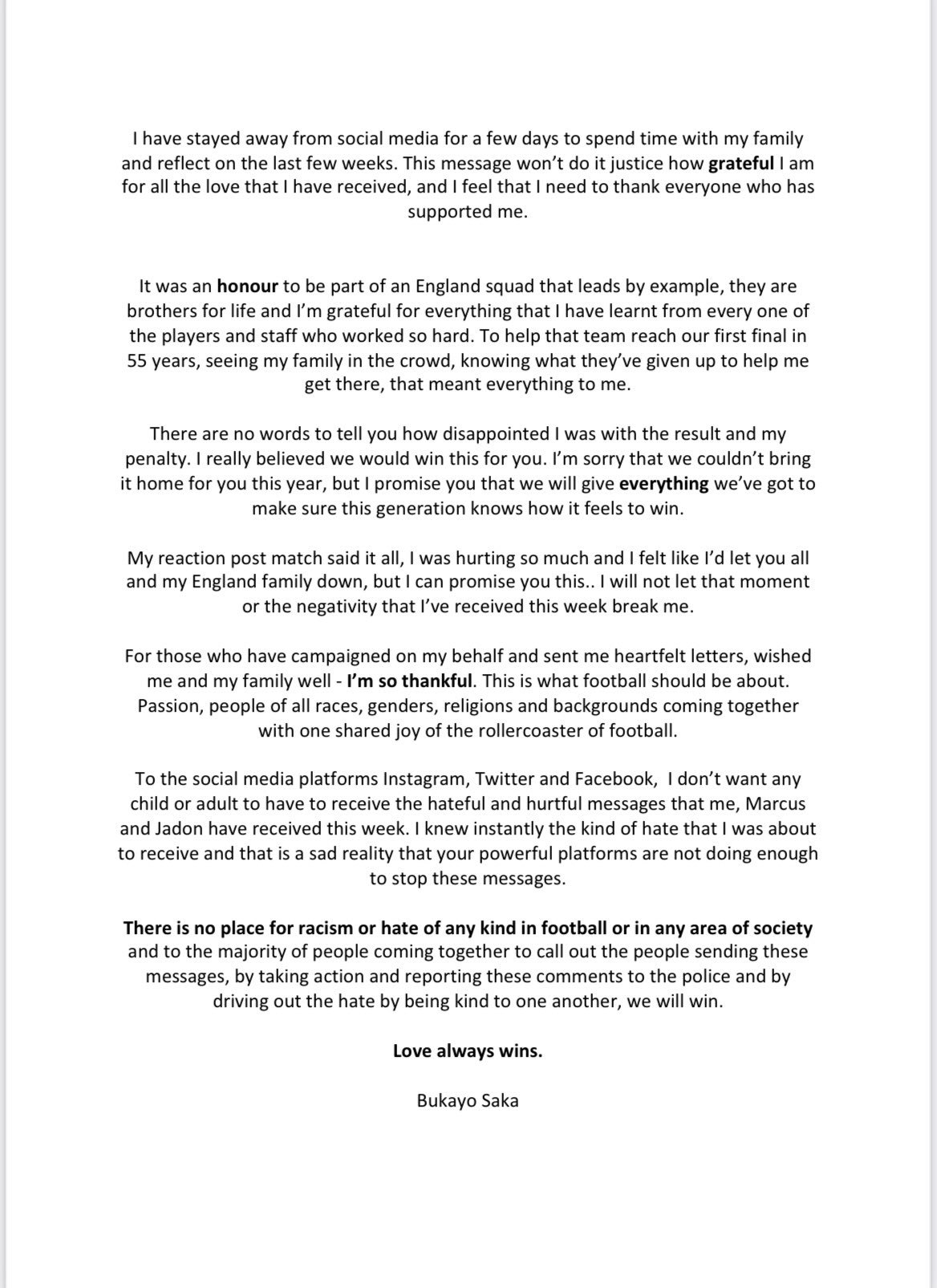 Saka thanked those who offered him support and love during the last few days and urged social media platforms to take action on racial abusers. The UK police has gone on to arrest a number of people in connection with online abuse directed at the England players.