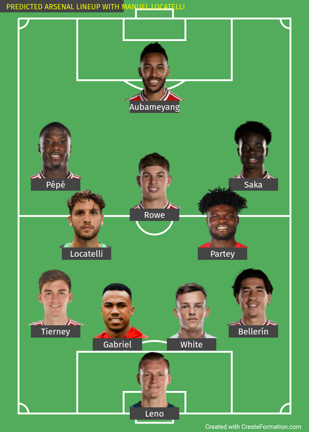TEXT FORM: Leno, Tierney, Gabriel, White, Bellerin, Locatelli, Partey, Pepe, Smith Rowe, Saka, Aubameyang
