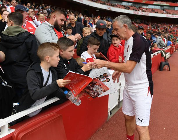 LONDON, ENGLAND - SEPTEMBER 08: Nigel Winterburn signs autographs for Arsenal fans before the match between Arsenal Legends and Real Madrid Legends at Emirates Stadium on September 8, 2018 in London, United Kingdom. (Photo by Stuart MacFarlane/Arsenal FC via Getty Images)