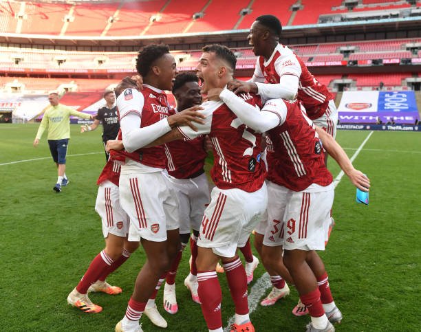 LONDON, ENGLAND - AUGUST 01: Arsenal players celebrate after the FA Cup Final match between Arsenal and Chelsea at Wembley Stadium on August 01, 2020 in London, England. Football Stadiums around Europe remain empty due to the Coronavirus Pandemic as Government social distancing laws prohibit fans inside venues resulting in all fixtures being played behind closed doors. (Photo by Stuart MacFarlane/Arsenal FC via Getty Images)