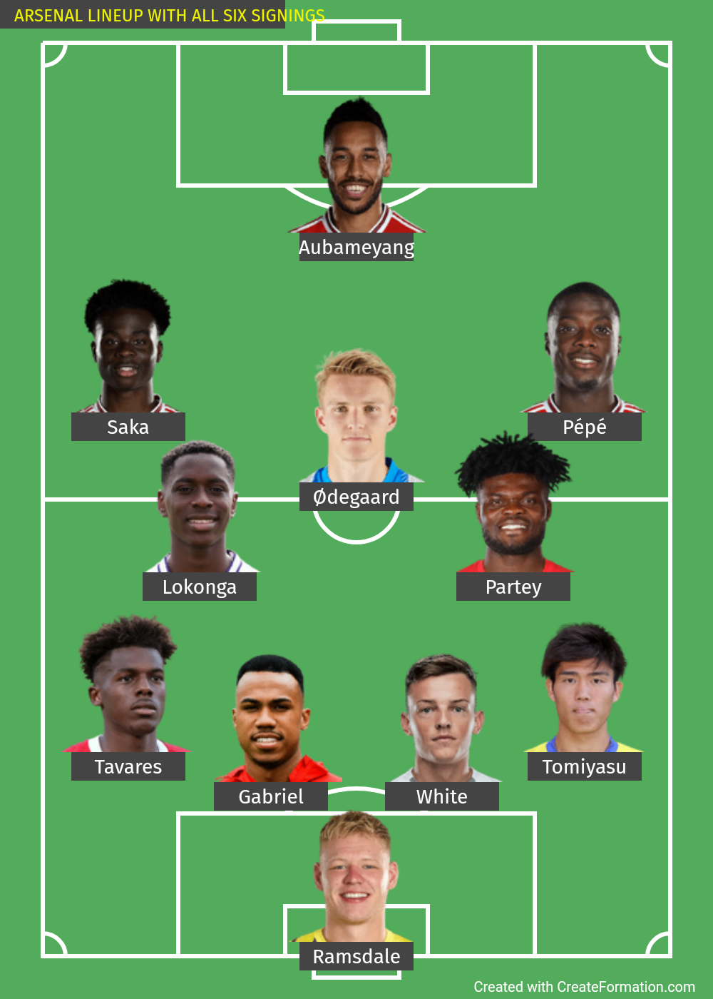 Ramsdale, Tavares, Gabriel, White, Takehiro, Lokonga, Partey, Saka, Odegaard, Pepe, Aubameyang