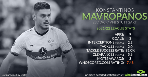 Arsenal defender on loan at VFB Stuttgart Konstantinos Mavropanos is ranked as the sixth most in-form player in Europe’s top five leagues based on the last six appearances.